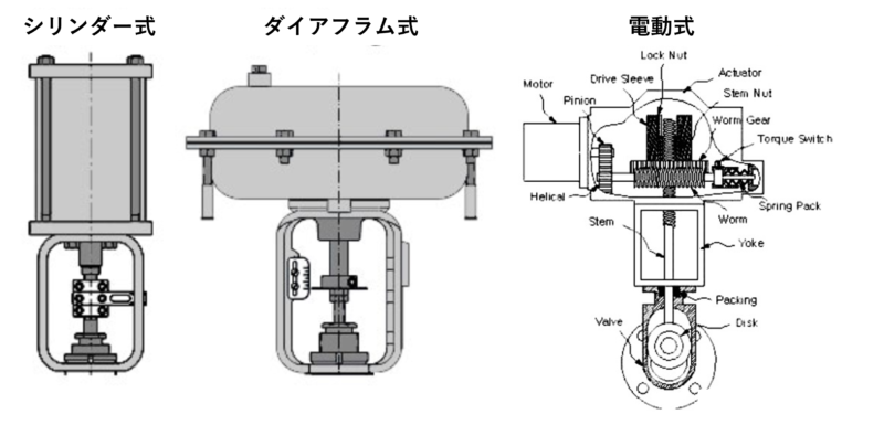 アクチュエータには空気式、電動式、電油式に分けられ、空気式にはダイアフラム式とシリンダ式があります。