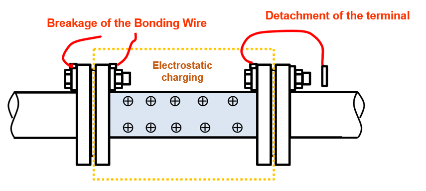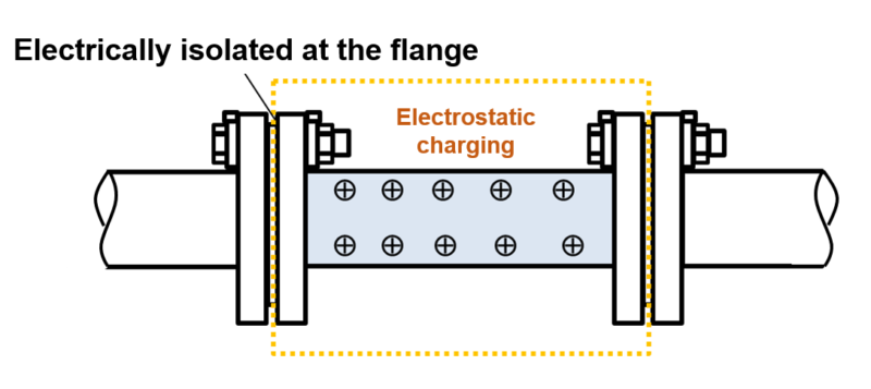 When piping becomes electrically isolated—for example, due to a non‑conductive flange gasket—the fluid inside the pipe can become electrostatically charged (flow electrification).