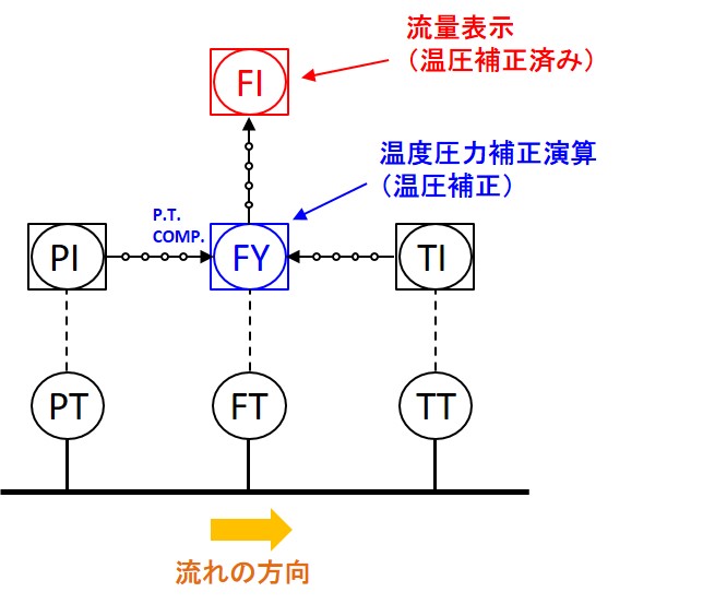 温圧補正の上図のように流量を計測したい流体の温度、圧力も合わせて計測し、その結果をDCS内部の補正演算機能(上図の「FY」)に温度と圧力の計測値読み込ませ、補正演算を行うことで補正値が得られます。この機能は標準的なDCSであれば一般的に搭載されています。