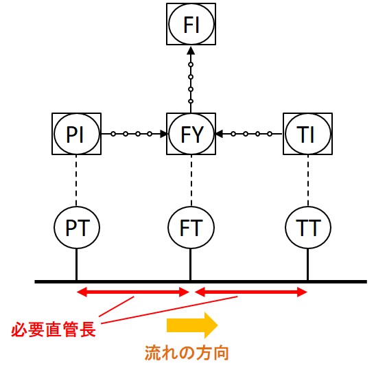 特に温度計は流量計からの距離が長いと放熱(放冷)により温度が変わりやすいので、誤差が生じる原因となります。そのため、温度計はなるべく流量計に近い位置に設置せねばならず、流量計の必要直管長が短い流量計の下流側に設置することが一般的です。