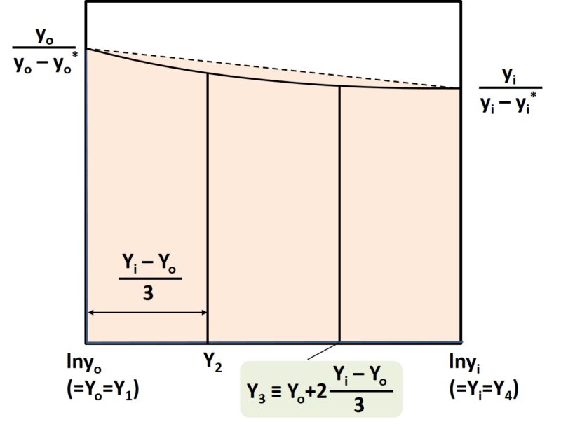 $${NTU}=\int_{\ln{y_o}}^{\ln{y_i}}\frac{y}{y^*-y}d(\ln{y})・・・②$$