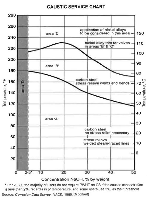 NACE SP 403では水酸化ナトリウムの濃度と温度でエリアA~Dに分類され、それぞれのエリアで推奨される配管材料が規定されています。