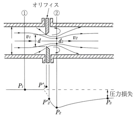 配管の途中にオリフィス板を入れると、板の上流側と下流側で差圧が生じます。この圧力差(差圧)が流量の2乗に比例することを利用して、測定した差圧から流量を求めます。