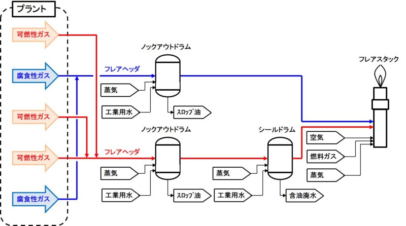 安全弁の二次側は大気開放やフレアー設備に接続されることが多いです。