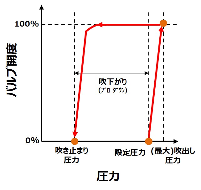 また、そのようなバルブの特性上、吹き始めてから吹き止まるまでの圧力差(吹下がり/ブローダウン)も逃し弁と比べて大きくなります。