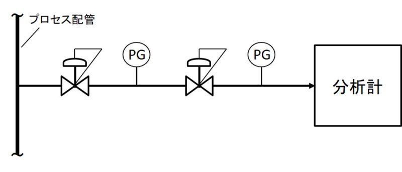 さらに分析計の必要圧力は数気圧程度と、低圧~微圧程度の圧力のため、プロセス配管の圧力が高圧であれば、上図のように多段階で減圧する必要があります。