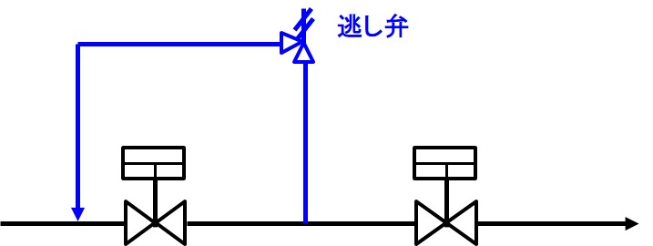 このような個所には、圧力逃し弁を設置することで閉じ込められた空間の圧力が上昇しても問題が発生しないようにする必要があります。 圧力の逃がし先については、通常は上流側につなげる事が多いですが、その妥当性についてはプロセス的観点から確認を行う必要があります。