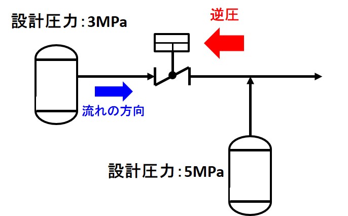 逆圧サービスとは、通常運転状態とは異なる条件下でバルブの下流側の圧力が高くなり、流れ方向の逆方向に圧力がかかってしまう工程のことです。上図では、通常運転では青矢印の沿って流れますが、設計圧力はバルブ下流側の方が高く、特定定条件では上図バタフライ弁の下流側の圧力が高くなり、赤矢印の方向に圧力がかかってしまいます。